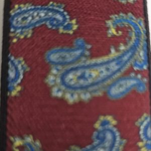Tirantes estampados cachemira en cintagrosgrain, o gros-grain, un tipo de tejido que se caracteriza por su aspecto acanalado. En grosgrain, la trama es más pesada que la urdimbre, con la creación de prominentes nervaduras transversales. Se llama un tejido «con cable», ya que la trama se asemeja a una cuerda fina. Grosgrain es una tela tejida plana con cable, con cuerdas más pesadas que en popelina, pero más livianas que en faya. Grosgrain tiene un aspecto con poco brillo, pero es muy fuerte. Históricamente grosgrain se hizo a partir de lana, de seda o de una combinación de fibras tales como seda y lana o de seda y mohair. Cuando se utiliza una combinación de fibras, el resultado final se da a veces el nombre grogram, seda mohair, gros de Tours o gros de Nápoles. Su aplicación en los tirantes Alsina, con estampado cachemira, le confiere una textura suave a la vez que elegante.